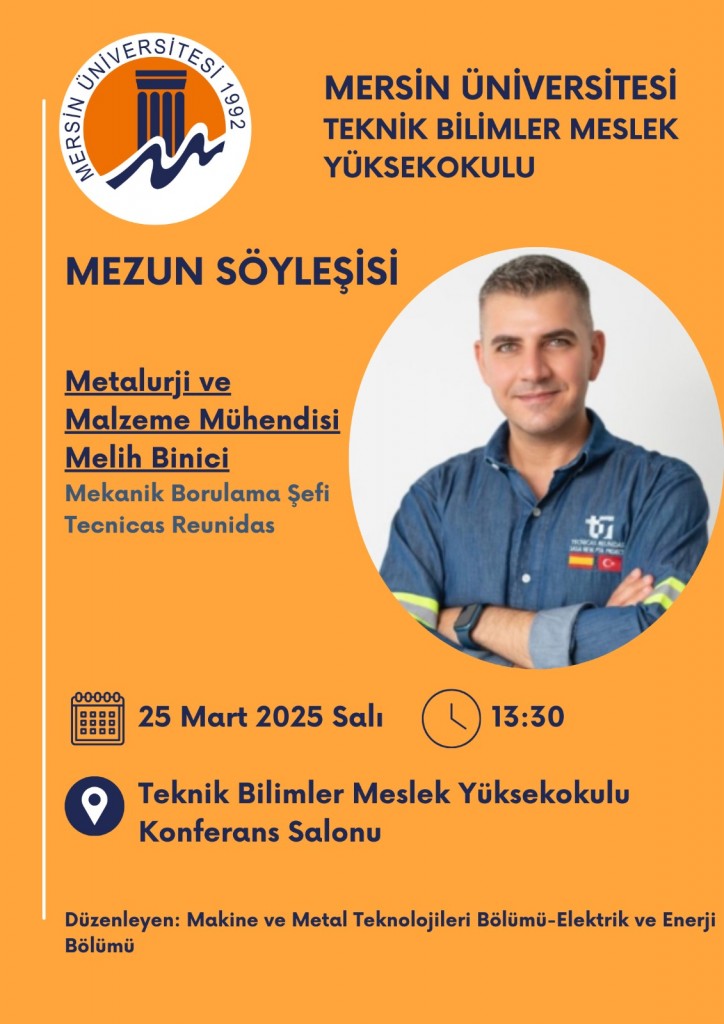 Makine ve Metal Teknolojileri Bölümü ve Elektrik ve Enerji Bölümü ortaklığıyla düzenlenen Mezun Söyleşisi etkinliğine, Makine programı 2010 yılı mezunumuz Metalurji ve Malzeme Mühendisi Melih BİNİCİ konuşmacı olarak katılarak, mezuniyet son