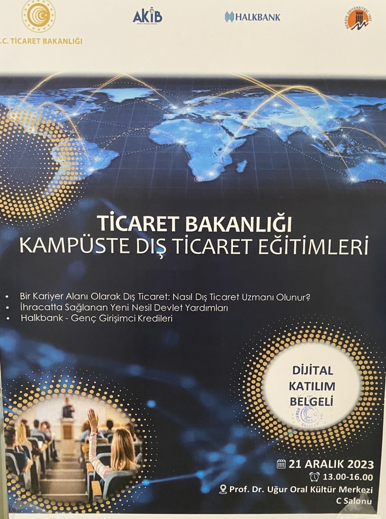 Ticaret Bakanlığı tarafından 21 Aralık 2023 tarihinde 13.00-16.00 saatleri arasında Üniversitemiz Prof. Dr. Uğur Oral Kültür Merkezi C Salonunda "Kampüste Dış Ticaret Eğitimleri" konulu eğitim düzenlenecektir. İlgilenen öğrencilere duyurulu