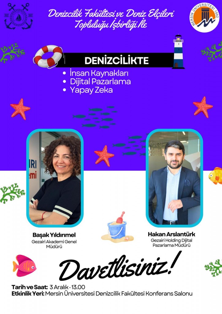 Fakültemiz ile Üniversitemiz Deniz Elçileri Topluluğu işbirliğinde 3 Aralık 2025 Çarşamba günü Fakültemiz Konferans Salonunda “Denizcilikte İnsan Kaynakları, Dijital Pazarlama ve Yapay Zeka” konulu seminer gerçekleştirildi.Seminer Gezairi