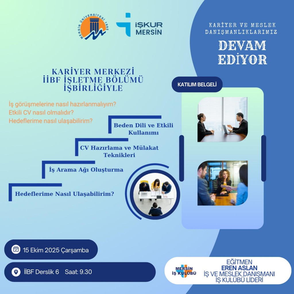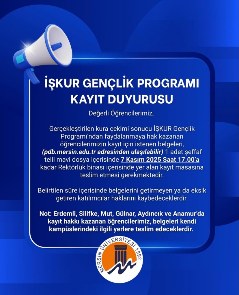 Mersin Çalışma ve İş Kurumu İl Müdürlüğü ile Üniversitemiz işbirliğinde düzenlenecek olan İŞKUR GENÇLİK PROGRAMI için başvurular 16.10.2025-20.10.2025 (5 Gün