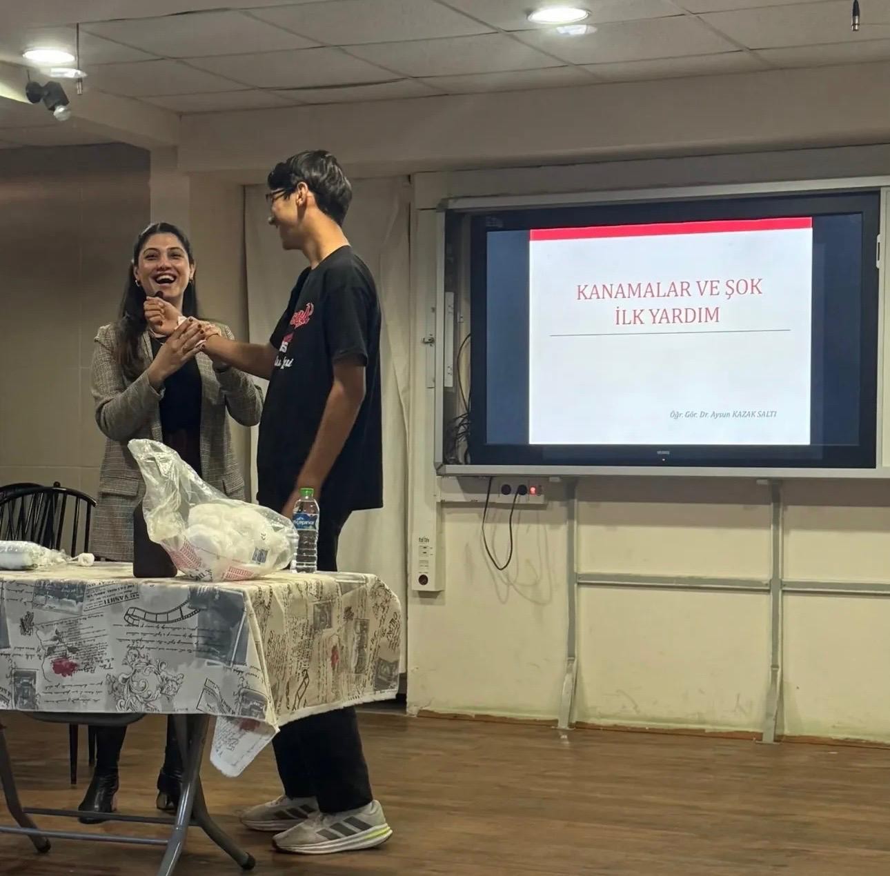 Yüksekokulumuz İlk ve Acil Yardım programı öğretim elemanı Öğr.Gör.Dr. Aysun Kazak Saltı, toplumsal katkı kapsamında Erdemli Kocahasanlı Anadolu Lisesi öğrencilerine yönelik ilk yardım eğitimi gerçekleştirdi.