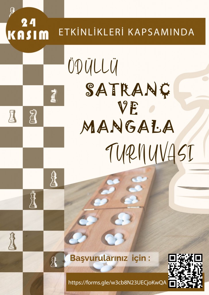 24 Kasım Öğretmenler Günü Etkinlikleri kapsamında "Ödüllü Satranç ve Mangala Turnuvası" düzenlenecektir. Turnuvaya Katılmak isteyenler 20.11.2025 tarihine kadar ekli formu doldurarak başvurmaları gerekmektedir.Başvuru Formu için