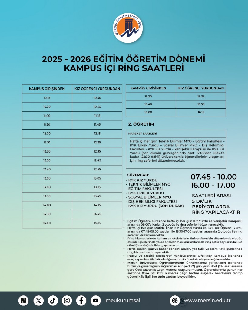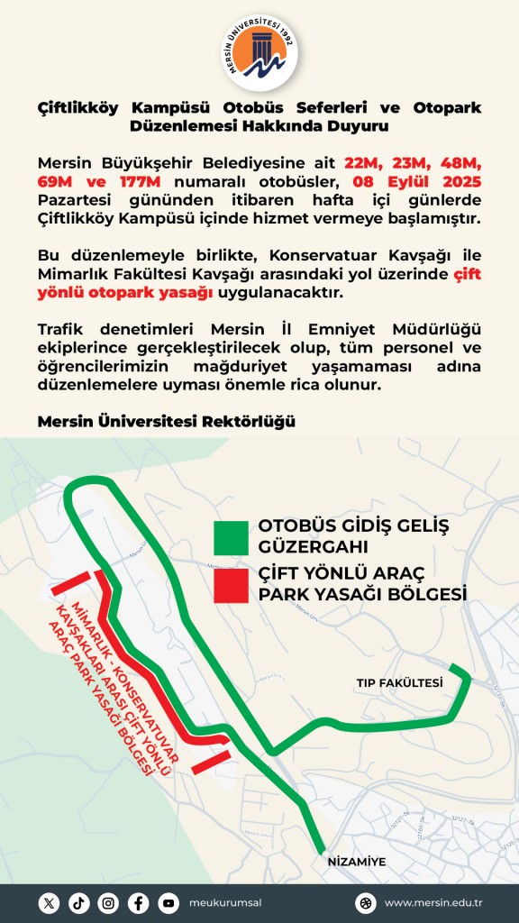 Çiftlikköy Kampüsü Otobüs Seferleri ve Otopark Düzenlemesi Hakkında DuyuruMersin Büyükşehir Belediyesine ait 22M, 48M, 69M ve 177M numaralı otobü